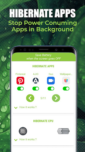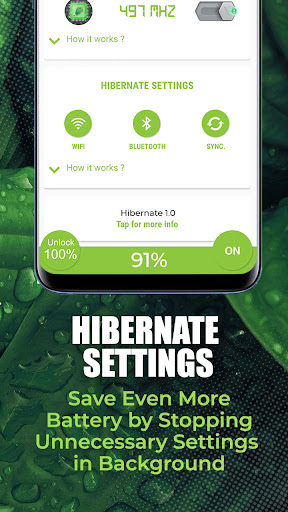Hibernate: True Battery Saver kills all the battery draining Apps, Lock down CPU to its lowest frequency, hibernate power consuming settings to save and extend battery life of your device.