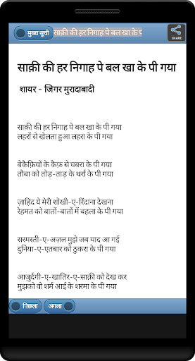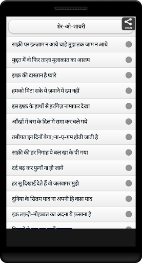 Presenting a selected collection of famous shayari(s) in Hindi. Nearly everyday new shayari(s) are updated. So keep watching this app time-to-time.This is a online tool to keep it up to date whenever you open, It requires internet connection to load.