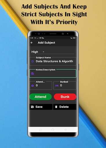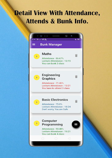 Bunk Manager keeps a records of your attendance as well as bunks of various subjects. You can customize the various subjects, it's attendance and total number of bunks, the app will tell you the maximum number of times you can bunk a subject maintaining minimum attendance.