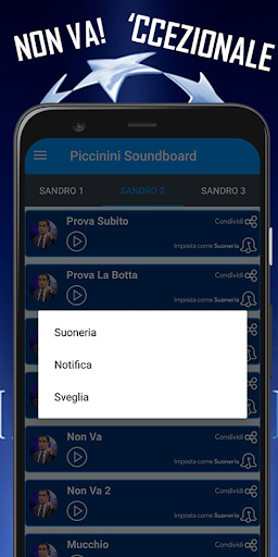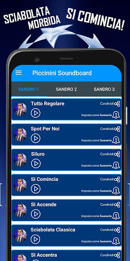 Piccinini Soundboard è ovviamente un'app molto divertente, creata per tutti i fan di questo celebre commentatore! Scarica ogni audio e impostalo come suoneria dei messaggi, delle chiamate e di tutte le notifiche! Tutto in formato audio scaricabile! Avrai cosi la possibilità di ascoltare le piu famose citazioni di sandro come ''sciabolata morbida'' , '' 'ccezionale '', ''proprio lui'' e tutte le iconiche frasi che lo hanno reso molto conosciuto e seguito in questi anni!