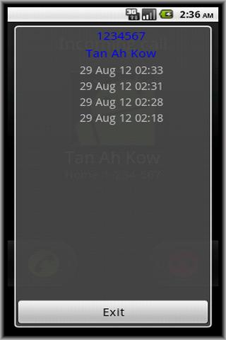 - Google Android SDK does not have API to override the incoming call screen. This app make use of an overlay on top to show the information. You need to tap exit to see the incoming call screen underneath.