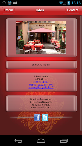 L'application "Le Royal Indien" vous offre la possibilité de consulter toutes les infos utiles du restaurant (Tarifs, carte, avis…) mais aussi de recevoir leurs dernières News ou Flyers sous forme de notifications Push.