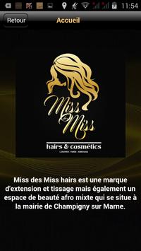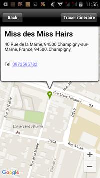 L'application "Miss des Miss Hairs" vous offre la possibilité de consulter toutes les infos utiles du salon (Tarifs, services, avis…) mais aussi de recevoir leurs dernières News ou Flyers sous forme de notifications Push.