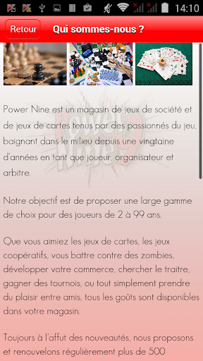 L'application "Power Nine" vous offre la possibilité de consulter toutes les infos utiles du magasin de jeux de sociétés (Tarifs, produits, avis…) mais aussi de recevoir leurs dernières News ou Flyers sous forme de notifications Push.
