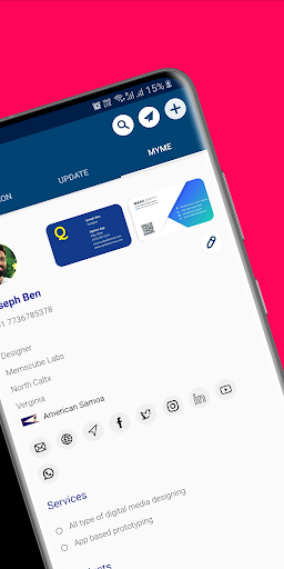MYME : MYME means profile. You can create a well defined business profile page with your profile picture, business card, mobile number, email address, profession, office or work address, all social links, services and products. Can share to anyone also.