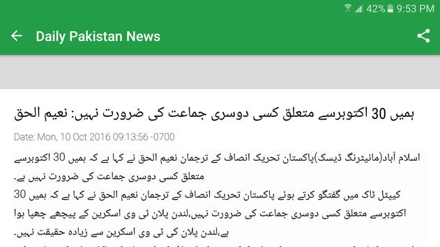 Get the latest and breaking daily news of Pakistan in Urdu from your favorite newspaper's websites - Daily Pakistan. We have live RSS feeds coming from their official sites. Explore Pakistan's (Karachi, Lahore, Islamabad, Peshawar, Quetta, Rawalpindi and more..) happening topics like, culture, business, politics, sports & more.