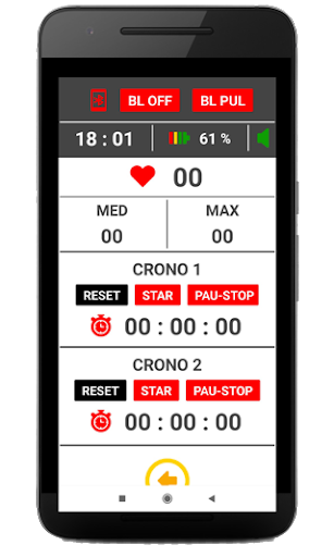 - GIMNASIO, una pantalla donde vas a poder conectar con el pulsómetr, controlar tu frecuencia cardiaca y ademas te ofrecemos 2 cronometros: 1 para que tengas el tiempo total y el otro para tiempos parciales.