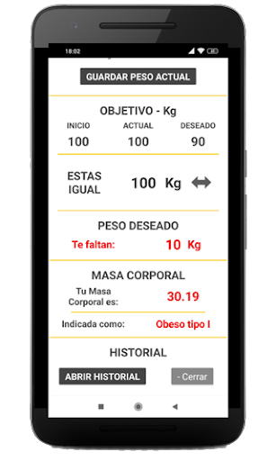 - CONTROL DE PESO, una simpática pantalla donde introducimos nuestros datos y vamos a poder controlar nuestro peso, con historial, con objetivo, masa corporal y varios.