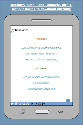 * If this application does not work correctly, try the Meetings TJ Lite version, free in google play or this link: https://play.google.com/store/apps/details?id=com.thunkable.android.danijedy.JwReunionesMini