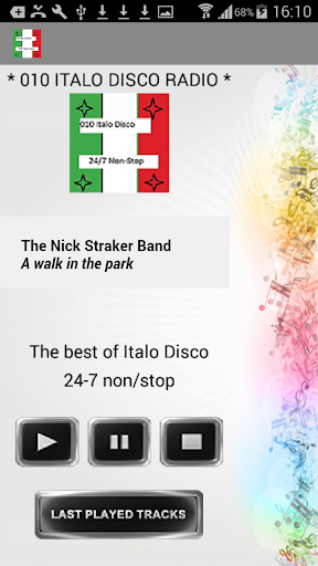 010 Italo Disco Radio: Music that came up in the 80s, and was played in discotheques. Today, Italo is still being made, but it is called now the New Generation.Many artists from the 80s make music again, e.g. Ken Laszlo, Albert One, Ryan Paris, Fred Ventura, Tom Hooker, etc. 010 Italo Disco Radio is broadcast from the Netherlands (Bergschenhoek).