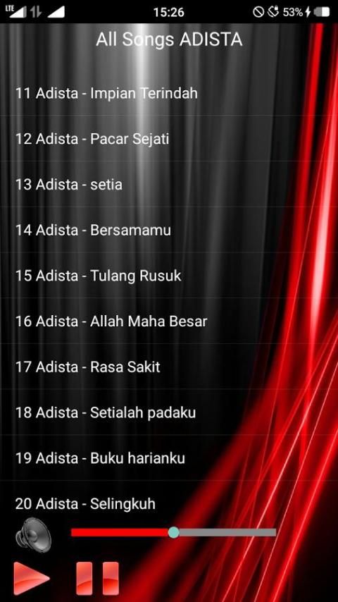 Semua Lagu ADISTA yang terbaru , terlengkap , terpopuler , bahkan lagu lama dan lagu favorit bisa anda dengarkan di aplikasi ini . karena aplikasi ini di buat untuk penggemar ADISTA dan penggemar lagunya . anda hanya bisa mendengarkan lagu streaming di aplikasi ini . aplikasi ini tidak menyediakan download lagu karena dapat melanggar hak cipta
