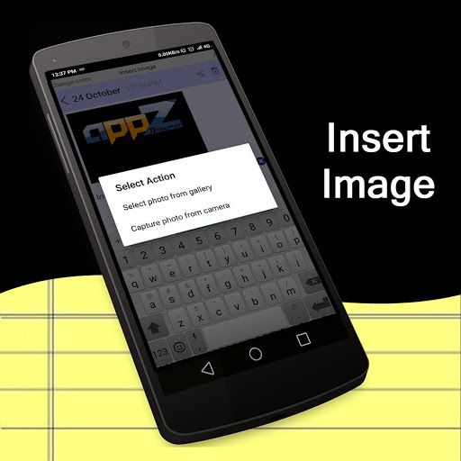 Add an image button. On its click a menu will appear with two options of selecting an image from Gallery or taking a new photo. If it's the first time when you clicked the button, application will ask for permission to access camera and gallery. After selecting an image or taking a photo, the image will be inserted in note.