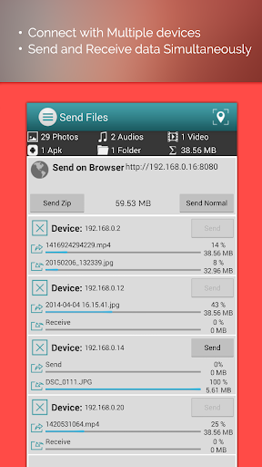 between devices, computers. Connected devices can send / upload & receive / download files at the same time by Wifi, WiFi Direct, Wi-Fi Tethering.