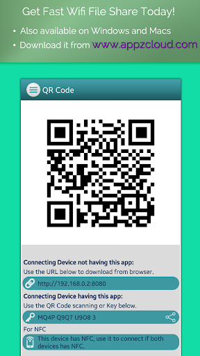 Devices which do not have the Share Files app, can receive files through a web browser. Manual Key code support. Zip file support & inbuilt web server share it. Supports Google Chrome, Internet Explorer, Mozilla, Firefox etc