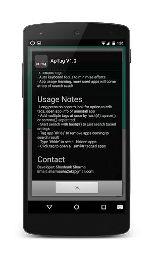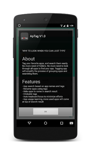 Tag your favorite apps, and search them easily. No more need of folders! No more need to look through all apps to find your app! Tagging app will simplify the process of grouping apps and searching them.
