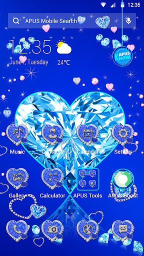 1. Diamond theme is free, but only compatible with APUS Launcher. If you want to apply it, please install APUS Launcher on your Android phone. Or download the theme and APUS Launcher. When you install APUS Launcher, there are variety of themes in APUS theme & wallpaper store, such as flower, butterfly, rose, gold, cool, cute cartoon monster, luxury gold business,black, simple, magic, sports(football,basketball,cricket),festival(Valentine's Day, New Year, Halloween, Christmas)、cute cat and dog, butterfly theme. Install APUS launcher to apply the cartoon theme. APUS can give you different style.