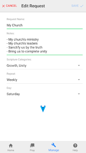 With Pray Through, you can specify how often you want to pray for a prayer request. For example, you can specify that a request be prayed for daily, weekly or even monthly. Pray Through will remind you when it is time to pray for the request. And it will remember whether or not you have prayed for the request and continue to remind you until you have prayed for it. So if you miss a day or even a week, Pray Through will keep track of what you need to pray for so that no request is left out. Also, if you are running short on time some days and do not complete the full list, that’s okay too. Pray Through will remember what you have and have not prayed for and adjust accordingly.