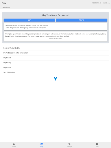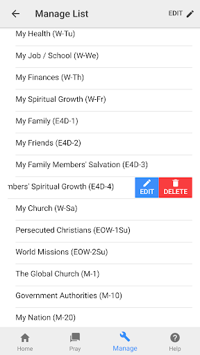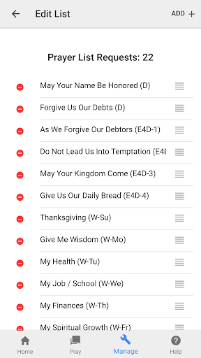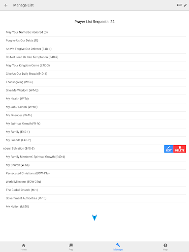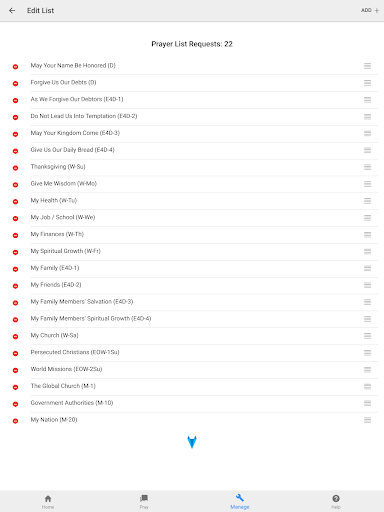 Pray Through comes with a preinstalled list of example requests. You can use this list as is, modify it in any way that suits you or delete it altogether and add your own requests. The example prayer list is based on the Lord’s Prayer (the Model Prayer) from Matthew 6:9-13 where Jesus taught His disciples to pray.