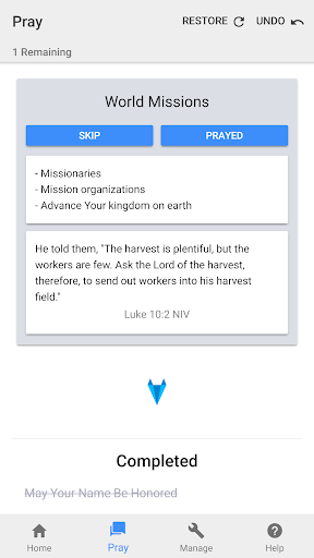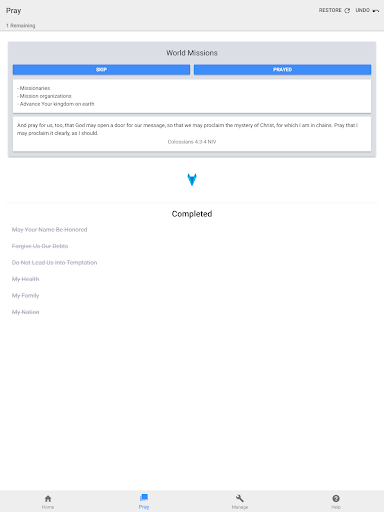When it is time to pray, the prayer app calculates a prayer list for that day. As you pray for each request, it is taken off the list and the app remembers that you have prayed for it. A new list is calculated for each calendar day.