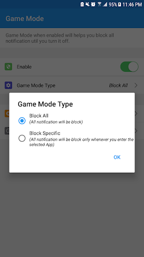 Game Mode helps (supports) you block all notification when you are playing game or application, please go to Choose Apps to select games or apps you want to apply.