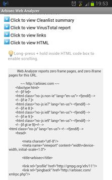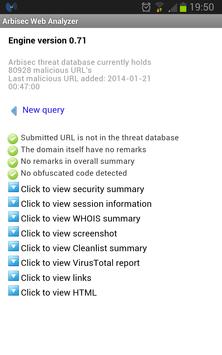 Arbisec Web Analyzer for Android provides an interface to the Arbisec Web Analyzer and the Arbisec Threat Database. This tool will let you analyze any web page to reveal links, coding, and if any links matches to malicious links in the Threat Database. The Web Analyzer also has an API connection to VirusTotal, which gives you instant feedback on the websites current security rating.