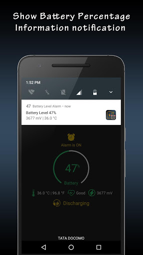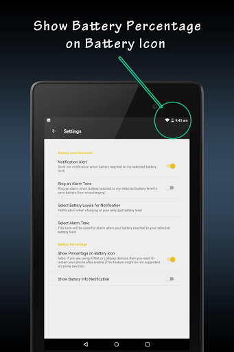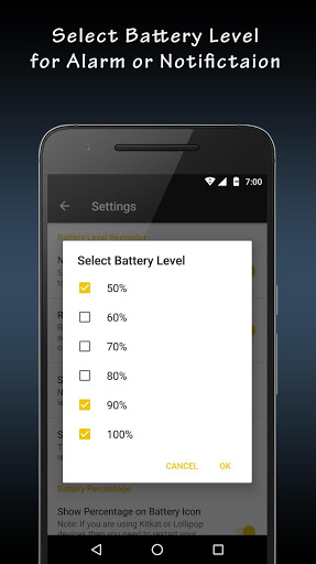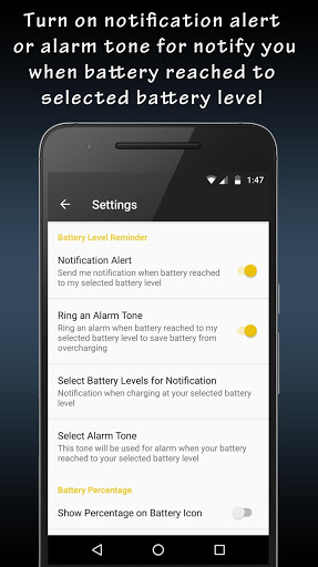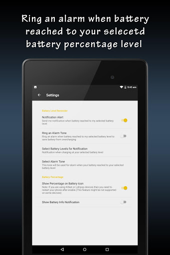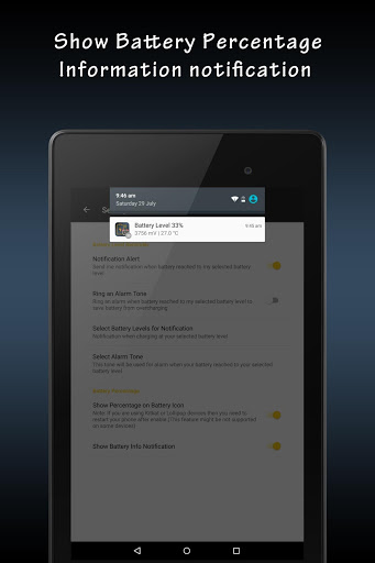 If you don't like alarm, then you can turn on battery charge notification feature. You can select different battery level for notification. This Battery level notification also shows you battery voltage and battery percentage info on your notification bar.