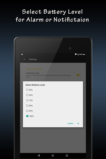 Battery Level Alarm app notifies you when your battery is fully charged. You can also select battery level and many customizations.
