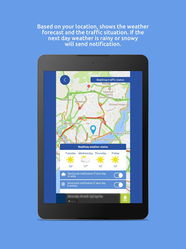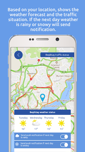 It shows the weather forecast for 5 days and the current traffic situation on the map. If the weather is rainy or snowy the next day based on selection, it will notify the mobile device.