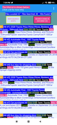 On the Scan screen, which is displayed after pressing a hit, you can launch the file in it's app. The search term for the hit will be stored in the clipboard, to make it easier to search in the launched app.
