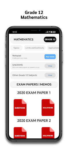 The app covers all the topics for Grade 12 Mathematics, which are grouped according to the four terms of the academic year: