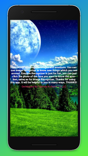 Use FREST to recognize images and emotions. You can use image recognizer to know new things which you see around. Emotion Recognizer is just for fun, you can just click the photo of the face you want to know the emotion, same as for Image Recognizer