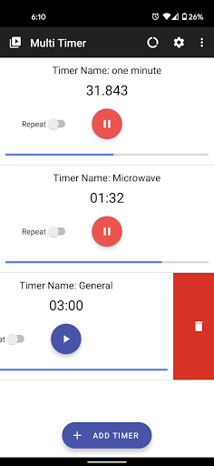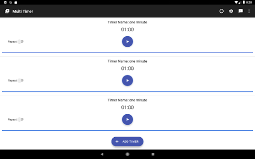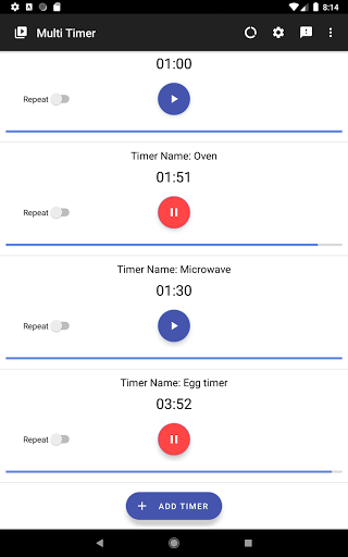 Run multiple timers on one screen with each timer with unique names. Allows you to add as many timers as you want to the list and keep track of multiple timers at once.