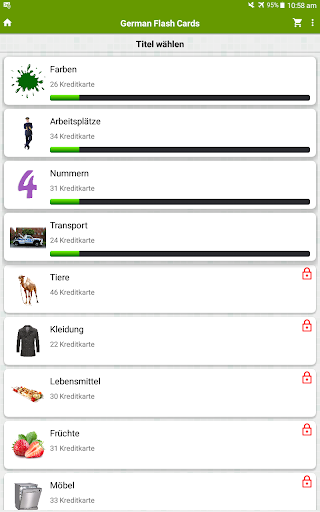 - In 13 titles (numbers, colours, transportation, verbs, places, clothing, furniture, jobs, food, desserts, vegetables - fruits, animals, body parts)