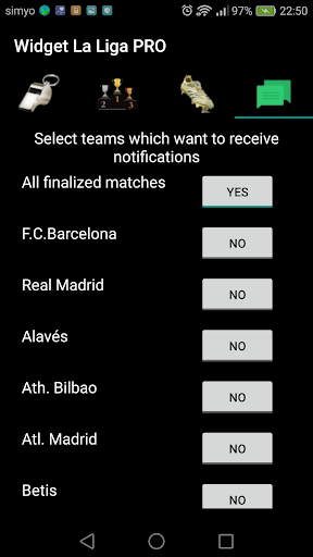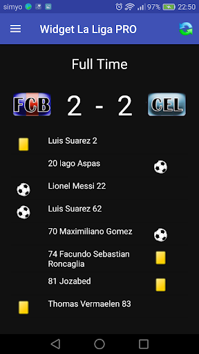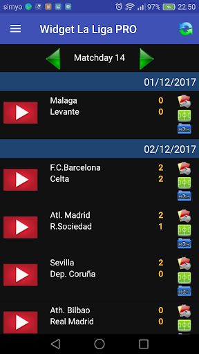 You see the result of the matches of your favorite (Barcelona, Real Madrid, Atletico de Madrid, Sevilla, Mallorca, Leganes, Espanyol, Betis, Eibar, Real Sociedad, Athletic Bilbao, Celta, Levante, Granada, Osasuna, Valencia, Alaves, Getafe, Valladolid, Villarreal), adds both widgets as you want, and to keep abreast of the best league in the world proves the implementation Widget La Liga PRO.
