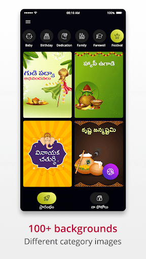 Telugu text art app is helps to send festival wishes to your friend and family member and celebrate festival like Diwali, New Year, Bhogi, Makara Sankranti, Kaanum Pongal, Maha Shivratri, Durga Ashtami, Holi, Ugadi, Sri Rama Navami, Good Friday, Telugu New Year, Dussehra, Ramzan, Sri Krishna Astami, Vinayaka Chavithi, Navratri, Vijayadashami, EID Miladun Nabi, Muharram, Raksha Bandhan, Christmas, Pateti, Independant Day, Republic Day etc.