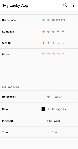 My Lucky App features a comprehensive luck dictionary that allows you to search for your daily luck associated with anything you can imagine. From animals to objects, dreams to thoughts, and everything in between, you can explore valuable insights and predictions based on your zodiac sign. Rest assured that no user data is collected during these searches.