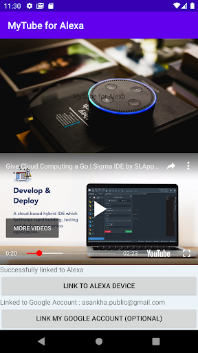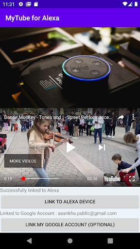 The MyTube Skill consists of two components - the Alexa Skill and the Android App. The Alexa device is linked with the MyTube app which is a basic YouTube player, which can be controlled by any Alexa device. You can then link the Android device playing the YouTube video to stream the output to the Alexa device via Bluetooth. The result is an Alexa voice controlled YouTube player for free, and with the best audio quality. Whats more the app is free, and does not require any special permissions or user data, and has no advertising. Optionally you can link your YouTube account with the App to load and play your private Playlists too!