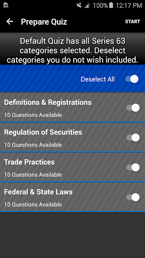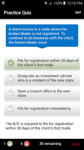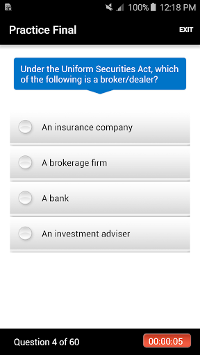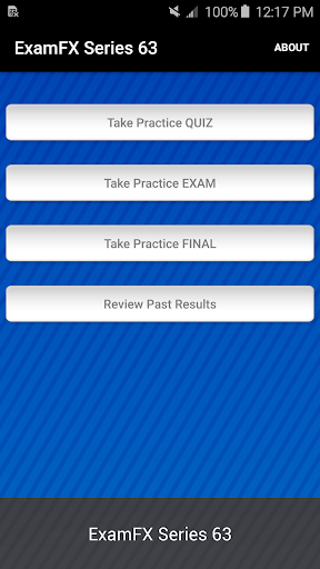 This app will provide you with a quick knowledge check to assess your readiness for the license exam. It contains short quizzes, a practice exam, and a practice final, using a set of questions relevant to the Series 63 NASAA license exam. Use this app right before you enter the testing facility to give yourself a refresher on some of the major areas you will be tested on. Do take note that this app is not a replacement for our online courses, merely an additional study tool to help you pass your exam the 1st time!