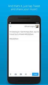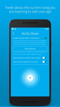 MuSo Share has one simple task, tweeting about the song you're currently listening to. We can detect whenever you're playing a song and push you a clickable notification which tweets about the current track you're listening to. We can also automatically add YouTube or SoundCloud links to the tweet so your followers also have something to listen to. MuSo Share runs in the background and detects the songs you're listening to. We do not save and/or any of this information, but give you the ability to do so.