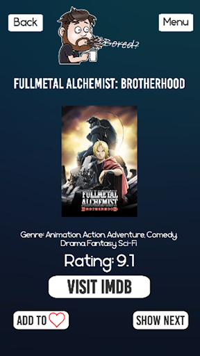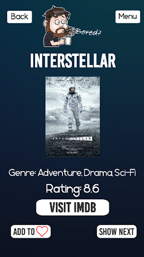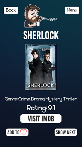★ Contains "MyList" feature to store the result to a personalized list so that you can access your favourite recommendations and watch it as per your convenience. You can also click on any stored item in MyList and get the IMDb ratings and other info again. As easy as you like!