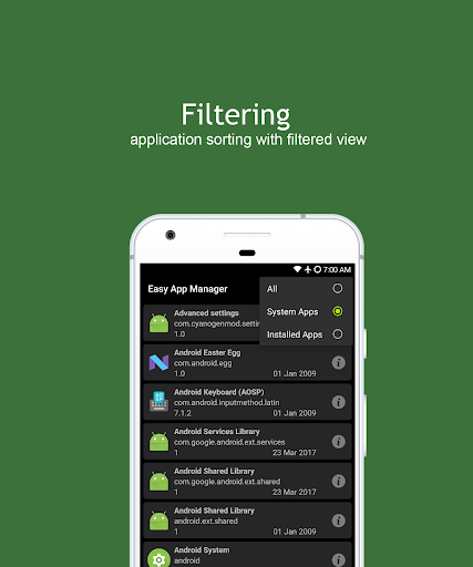 - Application can be categorized as All, System, Installed Apps
