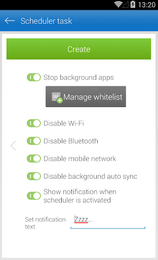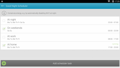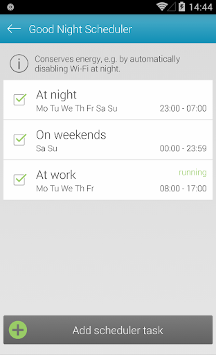 Is your smartphone always low on battery? Extend your battery life effectively and permanently with Scheduler. The app automatically disables background apps, synchronization and connectivity for customizable time periods and reactivates them otherwise.