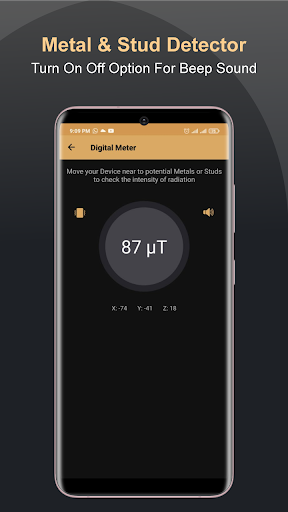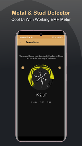 Metal detecter Sensor App & Metal finder scanner app for android have two types of meters to indicate the Metal Sensor readings. One is digital emf meter and other one is analog emf meter. This free electromagnetic field sensor app produces beep sound when notable emf is detected. This Metal Detector App with sound has a Sensitive meter detector to make it a reliable metal finder and stand out in list of metal finding apps.