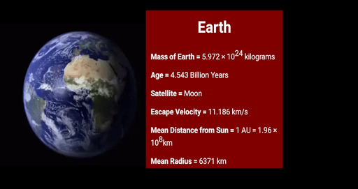 This app provides information about planet's mass, age, surface area, volume, escape velocity, mean radius, mean density, composition by volume, etc.