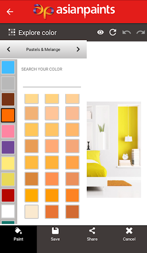 You can choose from a number of sample images already provided in the app and try different colors on the walls. The app contains a variety of images of different categories like- bedroom, dining room, living room, kitchen, and even exteriors. Choose the sample image you like. Then to paint the walls in the image, choose “paint” icon on the bottom left and tap on “explore” on the top left. You can choose from a range of colors that appear on the left side of the screen. And tap on the walls in the picture to paint. Or even better, to get a much realistic visual you can also take a picture of your own room which you want to paint. And start “painting” the walls in the picture. You can take as many pictures as you want. So, the next time you think of painting your room, try this app first.