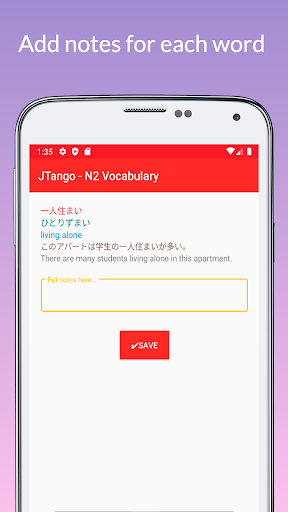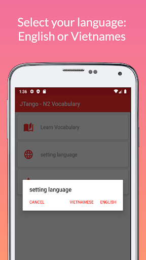 Japanese language learning app JTango N2 Tango 2500 with JLPT N2 Vocabulary from book は じ め て の 日本語 能力 試 験 N2 単 語 2500 (2500 Essential Vocabulary for the JLPT N2) (2500 tango N2).