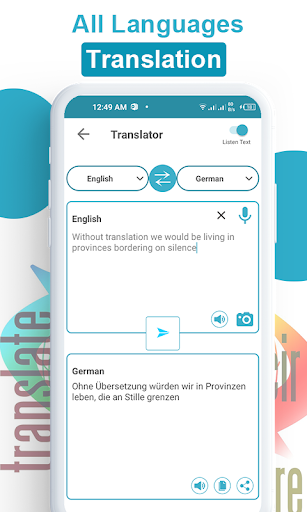 Text Translator: All Languages Voice Translate application gives the best quality Text Translation. It is an Easy and Fast Translator app free. Select any language of any country as an input language in the text translation box. Write your sentence, Phrases, Paragraphs and Words to translate in the Text Translation box. Click on the Translate button and see fast and easy translator results. You can copy and share translation text. Also you can pronounce any translated word by this text Translator app. Enjoy Multi Language Translator & Voice Chat with Multi Language Dictionary