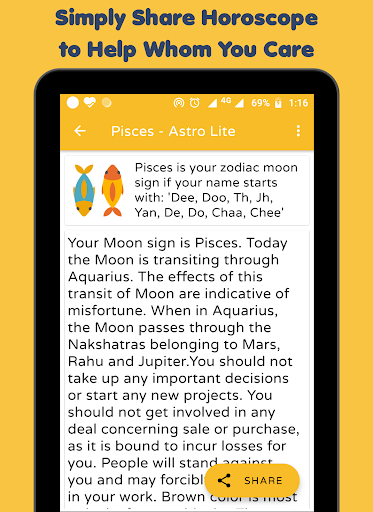 Indian Astro Lite Horoscope - Daily Free Indian Vedic Horoscope and Astrology tips application is a #1 lite size astrology and horoscope application for you. Get Latest Horoscope and your daily fortune prediction on your android mobile for free via Indian Astro Lite Horoscope app. You can also share Daily Horoscope with your friends using easy social share option. Daily Horoscope predictions are exclusively made according to your birth name zodiac signs and astrological signs with respect to the positions of all planets and sun and moon for that current day.