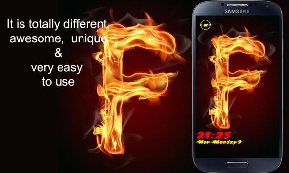 In 3D Burning F Lock, fire burn the F in real. The Fire animation is very smooth & awesome. This app will definitely liked by those, whose name starts with Letter F. When you name's 1st letter F comes up on your mobile screen with 3D stunning burning effect, you'll surely lost in it.