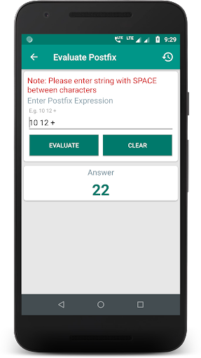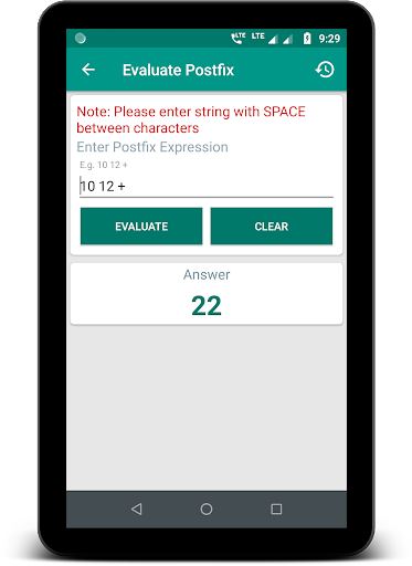 » Evaluate Postfix Expression - Enter space-separated numeric value along with the necessary operator and click on the Evaluate button to get the result.